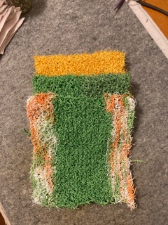 I’ve been drawn to most fiber related endeavors, where some form of “needle” is critical, since I was 6 years old. (That was many decades ago). I have developed a very experienced sense of touch. The better it feels the more expensive it is likely to be. I enjoy working with fibers that feel good and that special sense of “touch” is satisfied. This Lent I have chosen to work with a rough textured, corse feeling yarn called “scrubby” and to use colors that challenge me. You might ask why?