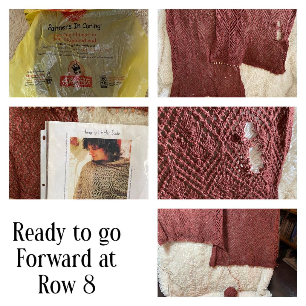 A few days later I searched my studio but could not remember the name of the pattern or where or even if I still had it. I would look at the bag every few days and somehow it got slowly moved away from my worktable and onto a shelf. I had to acknowledge a few hard truths about my knitting self: I am a bit of a perfectionist, I don’t like to ask for help, and I am not good at reverse engineering. I really needed the pattern to preserve as much of the length of the stole as possible. I told my friend I was thinking about how to fix it and mostly tried not to think about it at all. I wasn’t giving up, but I had no idea how to move forward. Time passed and I would have the occasional guilt trip and avoided calling my friend.