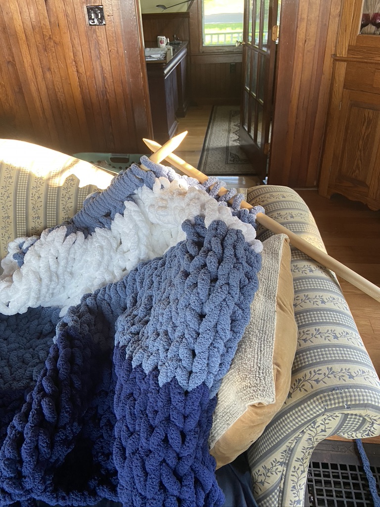 A friend gave me a pair of size 50 knitting needles. I couldn’t resist the call to try them out. I went to the store and found a super bulky yarn that was perfectly suited to the project. Knitting with size 50 needles is a workout. Each stitch requires some major manipulations but the end product was beautiful and soft.