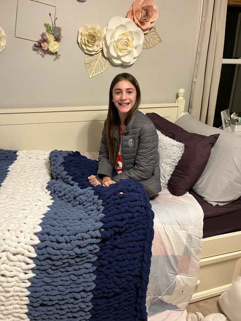 I forgot about the blanket until I saw a request from one of my daughters-in-law on a Christmas wish list. Our twelve-year-old granddaughter, Emma wanted a bulky knit blanket for her room. She had recently moved out of the room with her younger sister into a different bedroom that she could call her own. She had picked a gray blanket that matched the decor. I immediately thought about the bulky blanket sitting in the crib. I didn’t think she would like it. It wasn’t gray and what twelve-year-old would want something Grandma had knits? But I didn’t know what else to do with it and we were planning on driving to their house right after Thanksgiving so I put the blanket in a HUGE garbage bag and stowed it in the trunk.