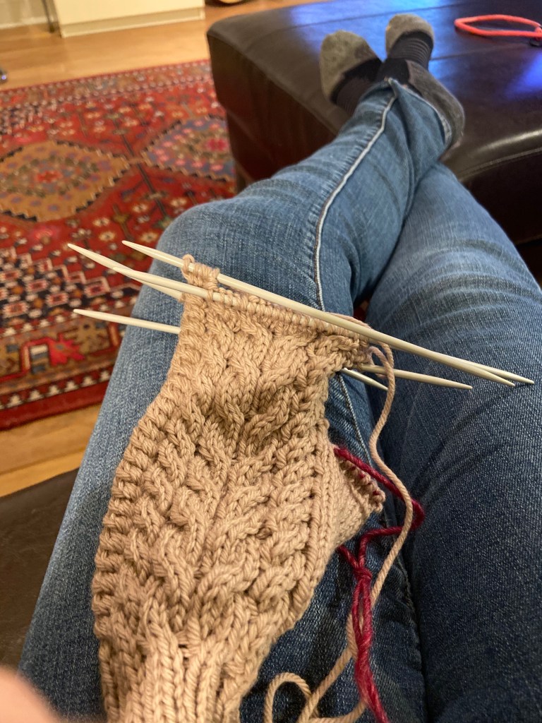 I think it’s because I’m using size 4 US needles and fingering weight yarn. These thin pieces of yarn require the knitter to aim. My knitting was asking for my attention.